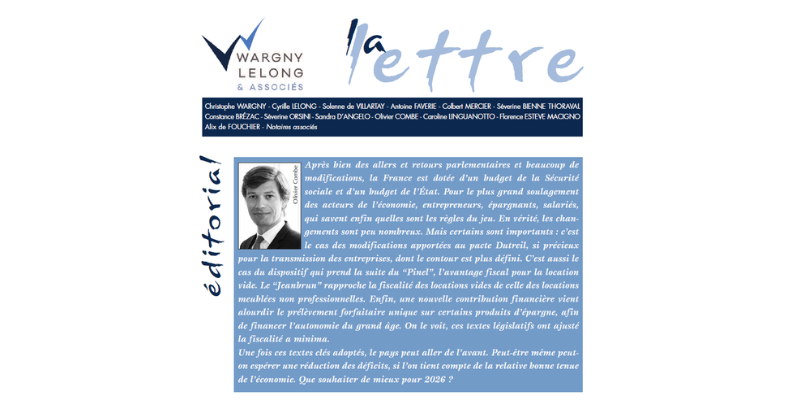 Dans cette nouvelle lettre, l’étude propose un décryptage des principales évolutions susceptibles d’avoir un impact sur la gestion du patrimoine, la transmission d’entreprise ou l’investissement immobilier.